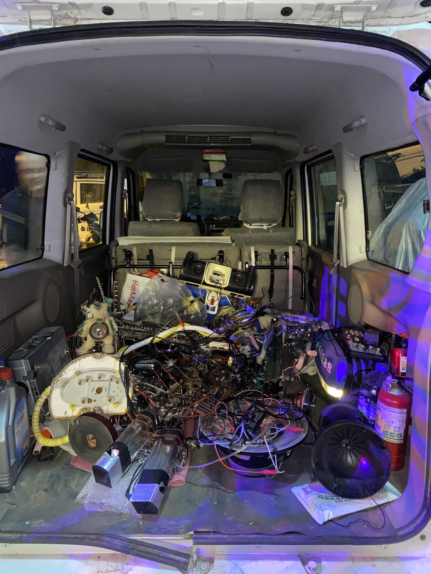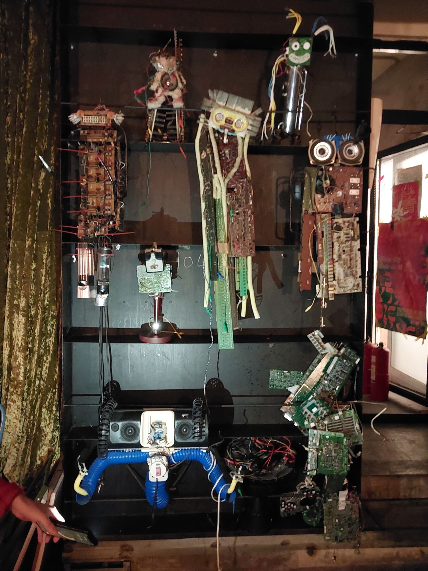 Β« Since the beginning, following in the footsteps of so many before me, I've been climbing up onto the path from concrete to abstract, from inanimate discarded machines and materials abandoned by their human owners, up to animated machines or robots, with sparks of life, personalities, souls, destinies, and eventually deaths. So it was that I was climbing Mount Negentropy, feet stuck in the mud of the concrete and heading towards the abstraction of life. Then I met Kayu Nakada. I don't know how he managed to fly straight to the top, but I think in this exhibition we set a landmark between abstract and concrete, a (galvanic) connection between faceless deities and "faceful" robots, between circuits, machines, montages and drawings. It may be seen in its most effective form in the "Cycle of Life", this pregnant creature secured on the ceiling of εζ, a 鯀顬 made of chaos, cables and plates, full of emptiness and light, whose pet name is Inochi (ε½) Β» /guibog