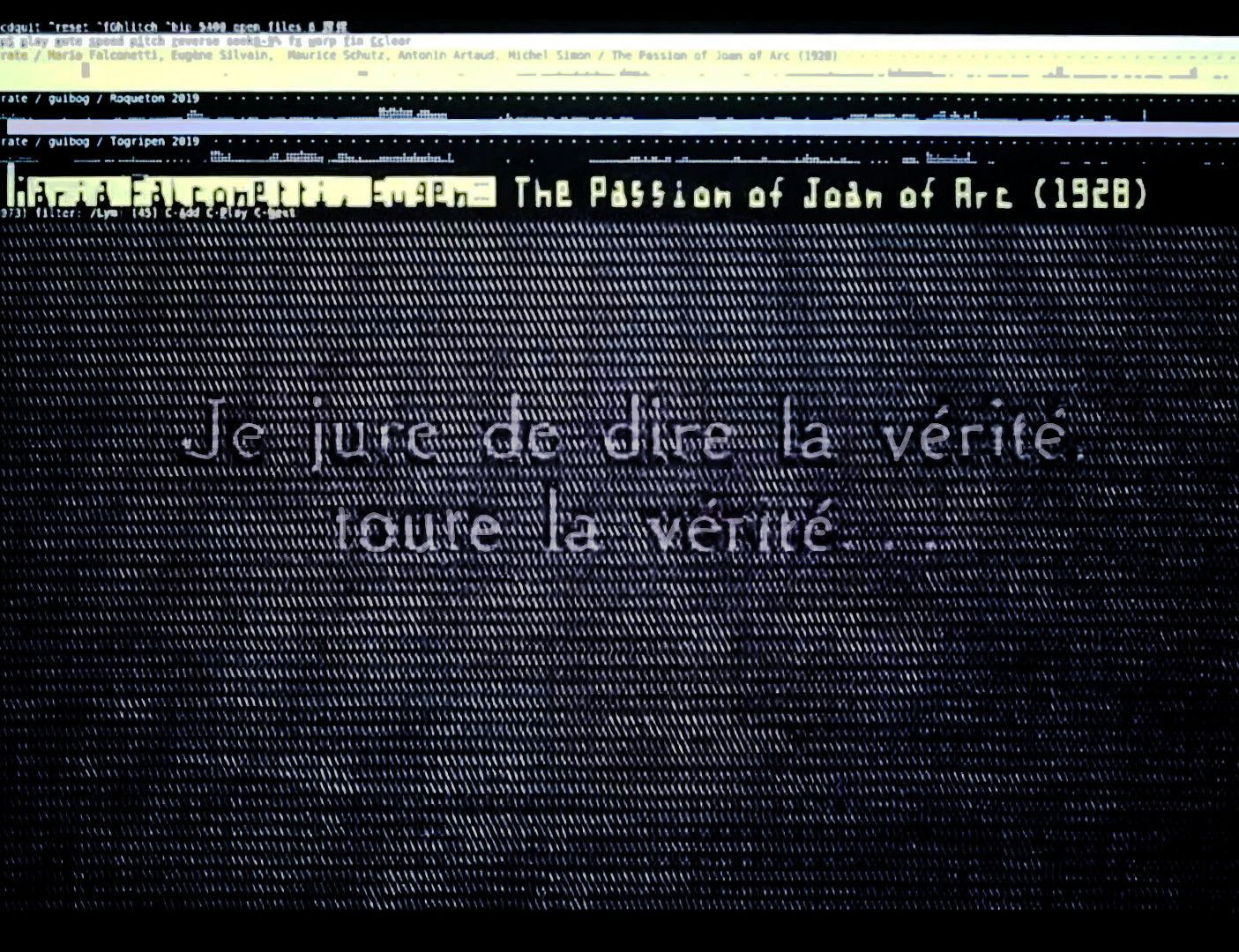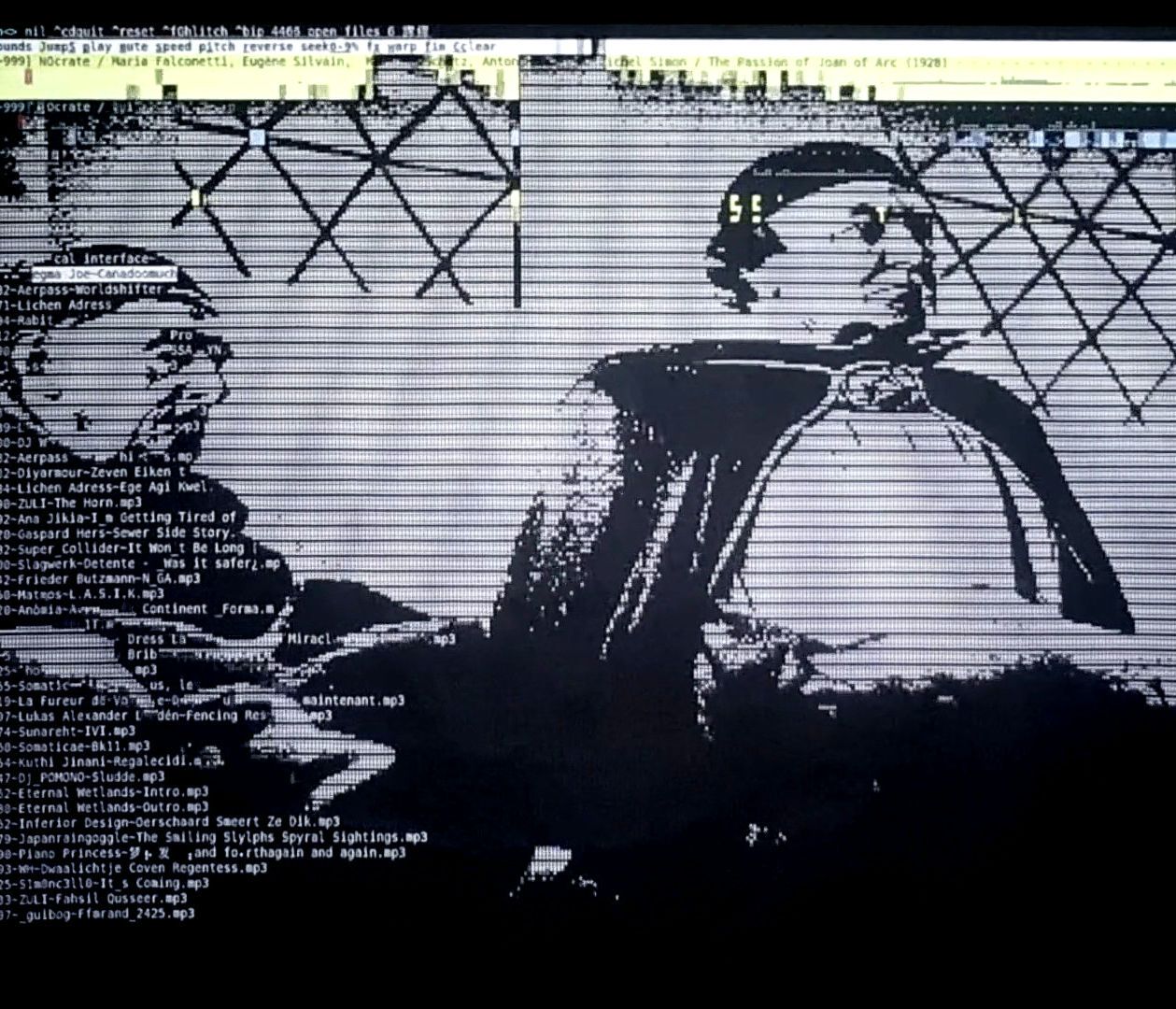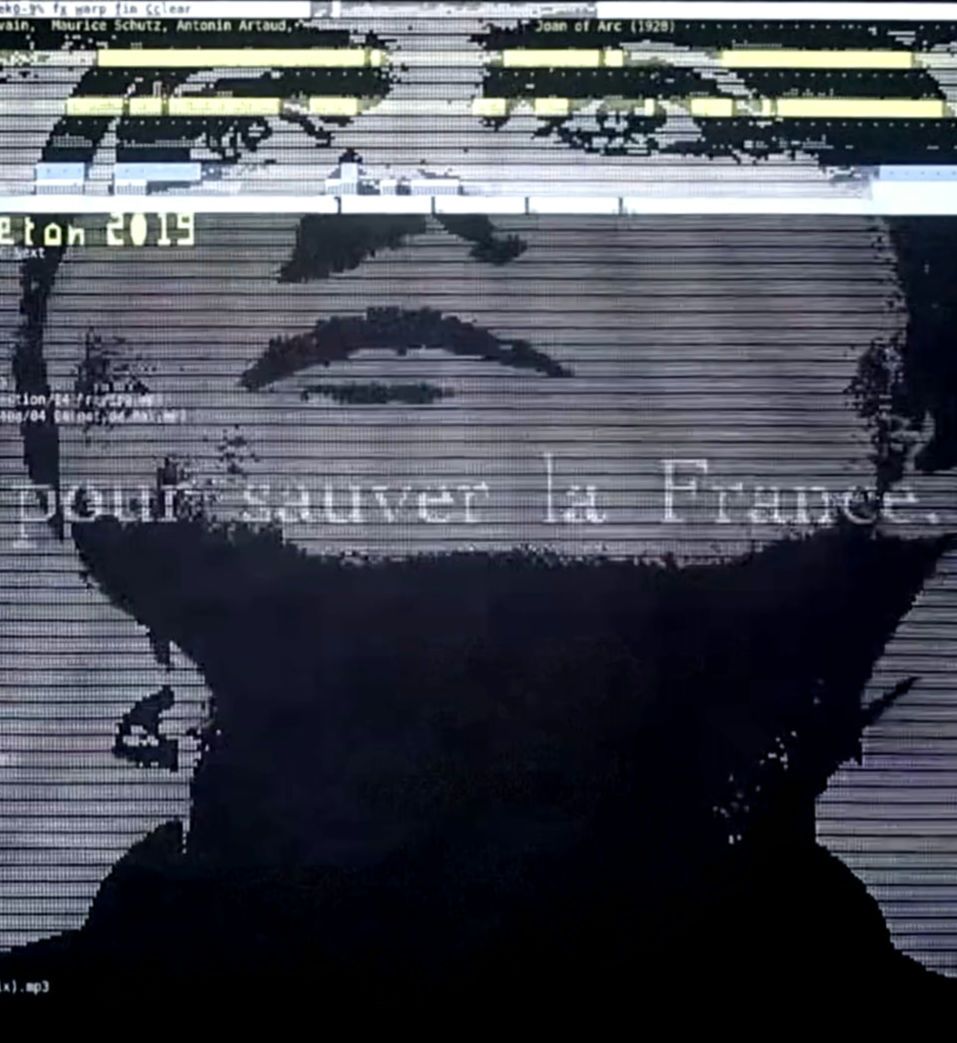 An event at Xiaozu around Bogdan Scoro, coming from Bucharest (Romania). I used miumiu.py, a home-made player, to show a personal interpretation of The Passion of Joan of Arc, the French silent historical movie based on actual records of the trial of Joan of Arc.