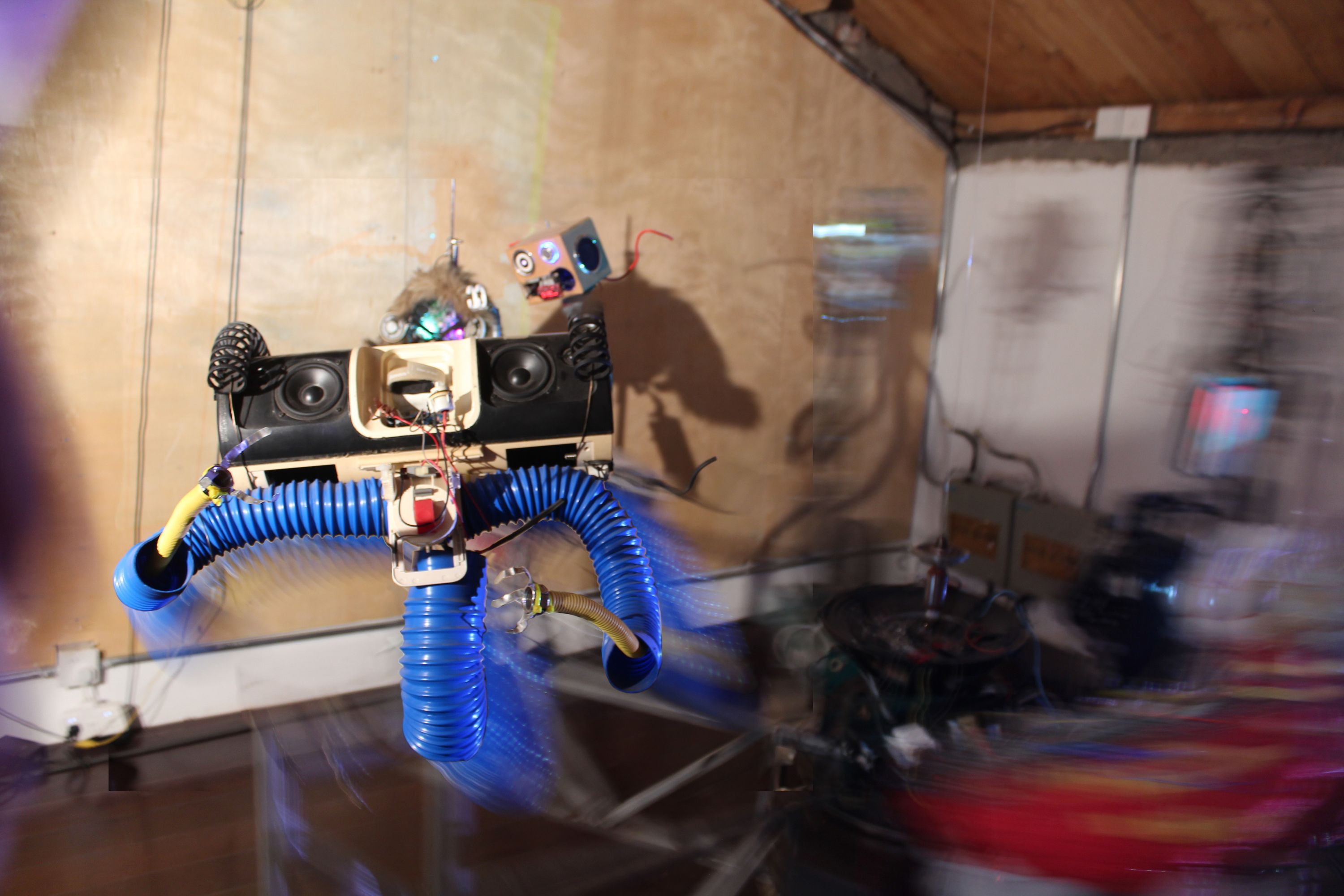 Babybot is born out of a big ipod stand and has accordion tube arms and torso, he was very loud and great support for other bots such as Platobot but is now mute, in a prolonged meditating state.