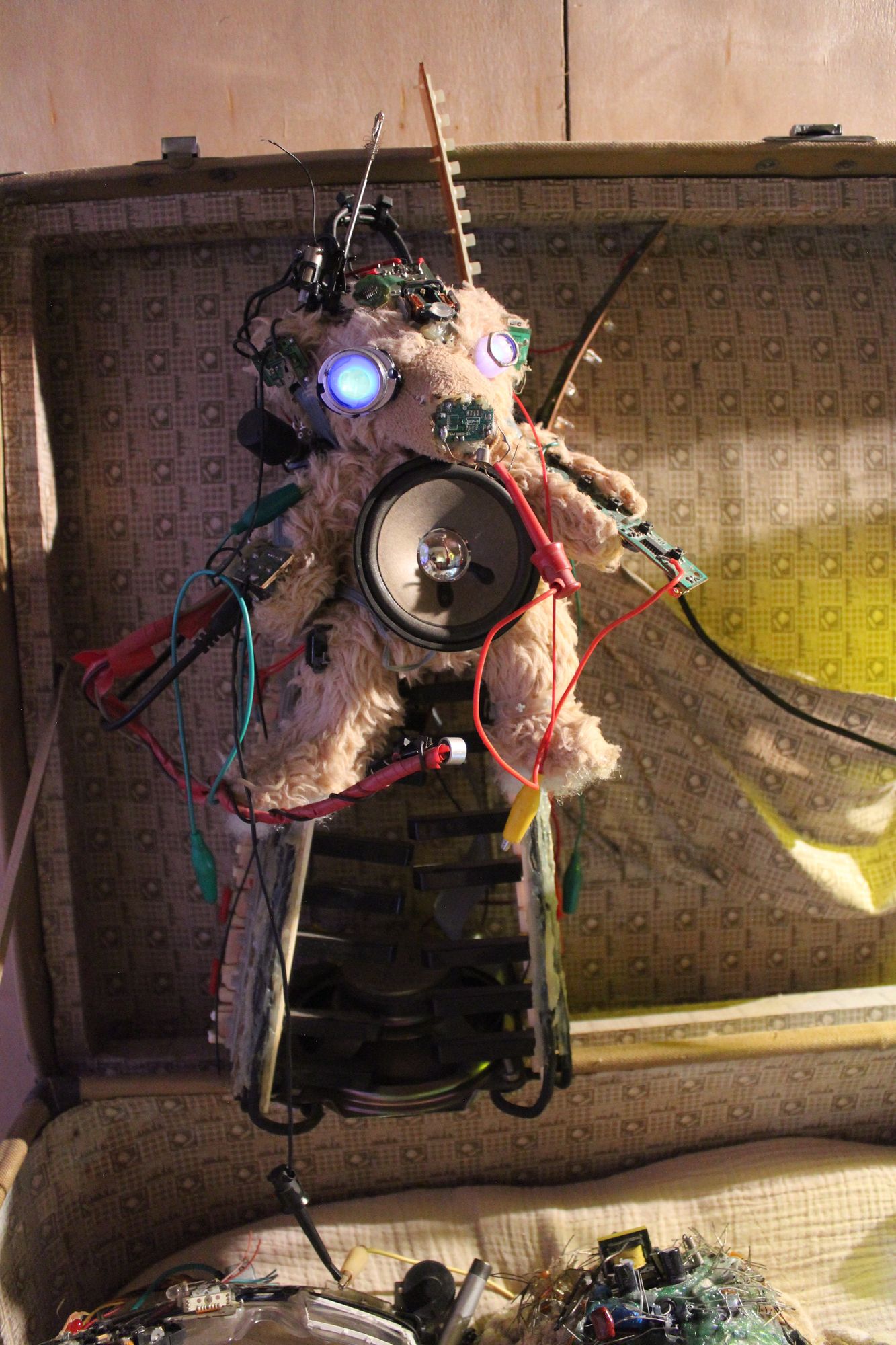 One of the first cybernฤtica, Cybear is born from a very cheap toy piano found at the flea market of Beijing, and a teddy bear that was of no use anymore for my kids. It has a rotating antenna wich worked for a while, and is good friend with Ju.