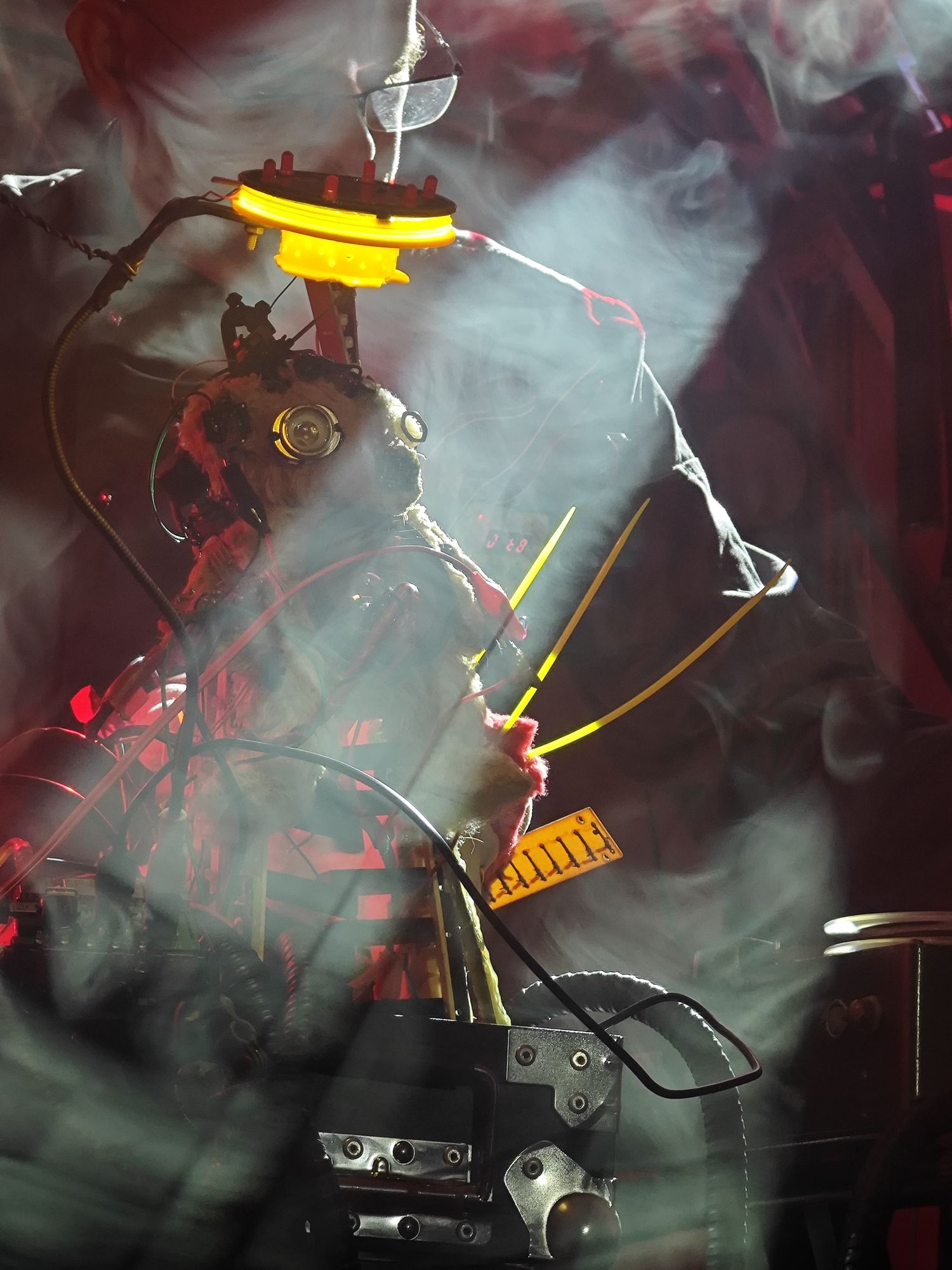 One of the first cybernētica, Cybear is born from a very cheap toy piano found at the flea market of Beijing, and a teddy bear that was of no use anymore for my kids. It has a rotating antenna wich worked for a while, and is good friend with Ju.