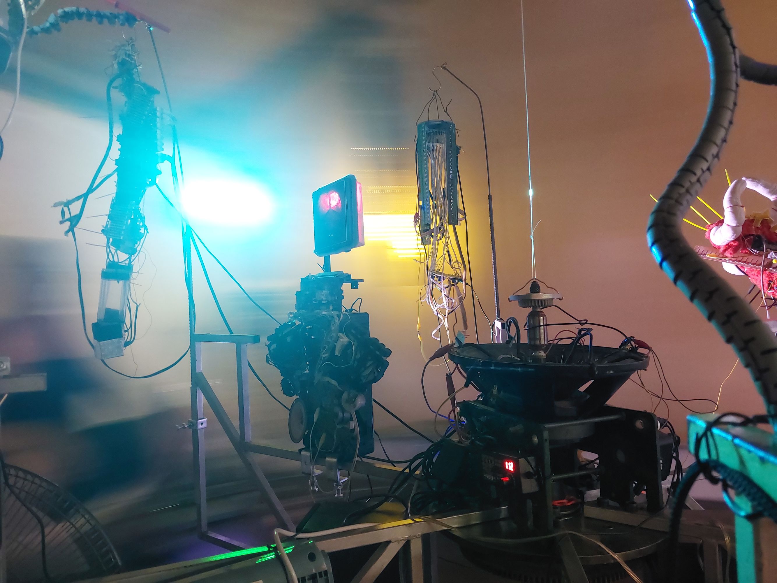 Also called "LED soup", or "LED BBQ", Warm Little Pond is a crackling soniferous contraption. A big loudspeaker mounted with circular anode and cathode,